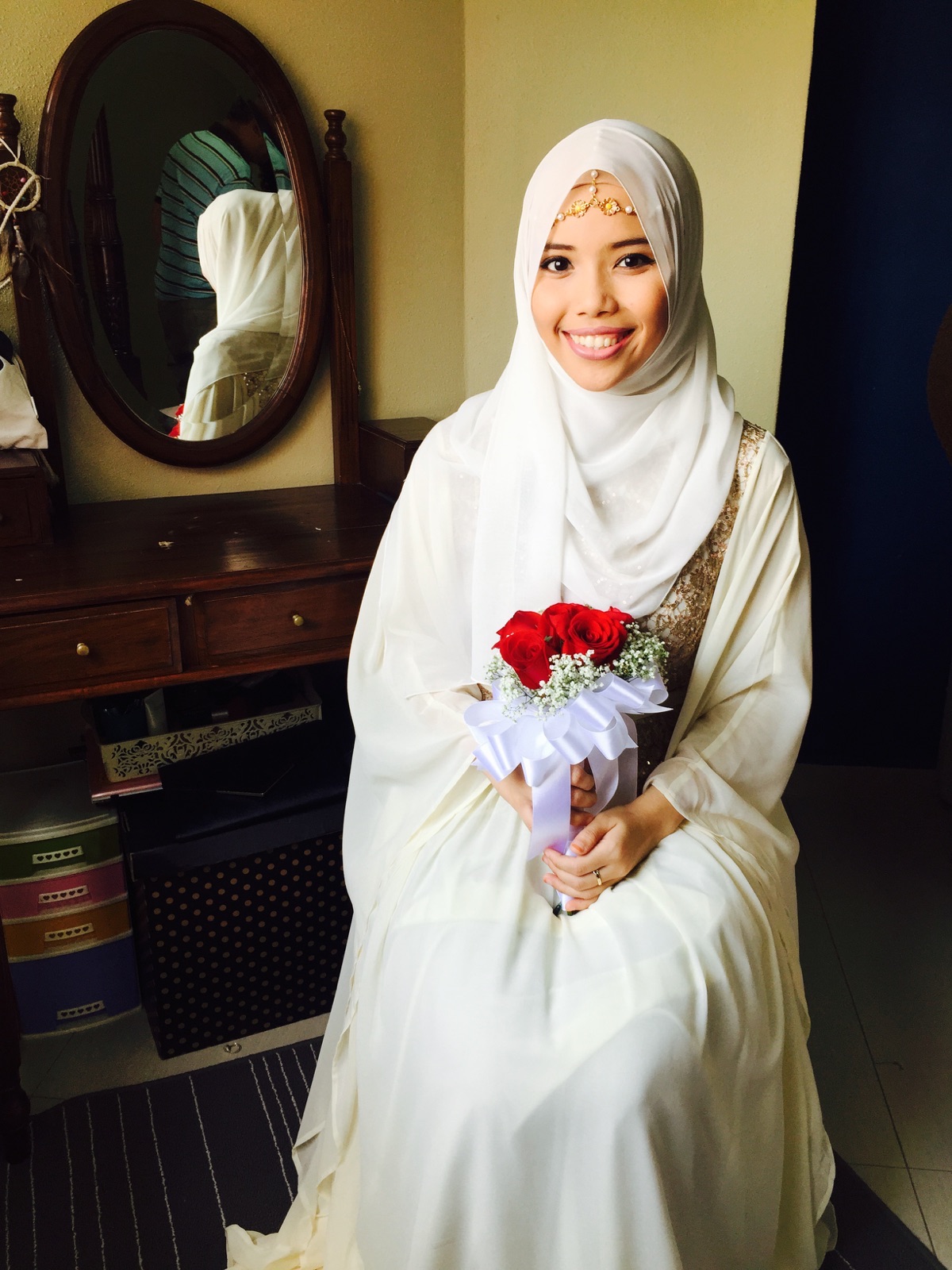 By 3pm, in the midst of getting myself ready, my relatives began arriving and I began panicking because I had not put on my outfit. So I quickly applied some make-up with attempts to hide my scars and dark circles, wore the outfit and styled my hijab. Oh, and I am proud to say that I did my make-up myself. It's pretty decent considering the amateur level I am at. Also, I thought I wouldn't be holding any hand bouquets for my engagement because my mom was not really keen on the idea of having one. But my aunt sneakily surprised me with one and I got to say I super loved loved it as it complemented my dress! Although it was a simple one with red roses surrounded by baby's breath. I totally loved it! Plus, my mom could not do anything about it and she accepted it anyway in the end hehe.